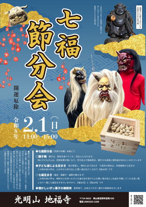 *月例行事(急用等で出来ない時もあります) 絵本の読み聞かせ *2月1日(年によって、日付変更します) 七福節分会 *8月13日(日付固定) 地蔵盆(ろうそく祭) *8月16日(日付固定) 施餓鬼会 各行事詳細は、下記を御確認ください![]() 月例行事 日時: 毎月第1土曜日 午前10時から(約30分程) ※8月、1月、2月はお寺の行事と重なりますので、お休み致します。また、急用等で出来ない時もあります 内容: 絵本の読み聞かせ どなたでも参加自由(無料)です。 子どもさん、お孫さんと一緒に遊びに来ませんか? お一人でもお気軽にお越しください。 ![]() ![]() 第9回 ************************* ************************厄除開運 地福寺にお祀りされている木造の大きな大黒天様 300年以上前から地福寺に鎮座され、多くの方々に拝まれてきた霊験あらたかな大黒天様 ![]() 日時 : 2月1日(日曜日) 14時〜15時 場所 : 地福寺 今年の節分会ポスターは、イラストレータ麻由さんがデザインしてくださいました ![]() 内容 【七福節分会(厄除け祈願) → 獅子舞 → 鬼が登場し子ども達による豆まき → 七福豆まき(福豆・福菓子・福餅を撒きます)】詳細は下記 本堂にて*七福節分会(厄除祈願) ![]() ![]() ![]() ![]() 獅子は、邪気を食べてくれ、厄払いになります。 特に子どもさんは、厄除効果が強くなり、学力向上や無病息災、健やかな成長に御利益があるといわれています 子ども達による豆まき 鬼が登場し、晴天の場合は、境内に出て豆まき 雨天の場合は、本堂縁側から豆まき この時の掛け声は、心の中から呼び出した悪い鬼が出てくるので【鬼は外】です ![]() 何で「鬼は外」から「鬼は内」になるの? 本物の鬼は、どこに居るのでしょうか? 本物の鬼は、私達の心の中に居ます 心の鬼は生まれてから死ぬまで、ズーッと1人1人の心の中に居座り続けているのです 外には出て行かないし、完全に消滅させることもできません じゃあどうすれば・・・そう、その悪い鬼の心を改心(かいしん)といって、良い鬼の心にかえていくしかありません 常に心の鬼と共存しているのが我々人間なのです 心の中には、鬼だけでは無く、たくさんの心温かい神様や仏様も存在しています ![]() 松本明慶大仏師が鬼について次のように言われています 『口伝の中に「心に鬼を持て」というものがあります。「あなたは鬼だ」と言われていい気はしませんが 「あなたは仕事の鬼だ」と言われると嬉しいですよね。 要するに心の鬼を育てて「魂」「魅力」を持つということ 鬼の部分を追い出してしまうと、いいものは作れないということです』 ![]() 心の悪い鬼を呼び出し、「鬼は外」と言いながら、純粋な心を持った子ども達が豆をまいて鬼を改心させ 最後は良い心をもった鬼となり、自分達を護ってくれる最強の守護神となって 心の中へ帰って行くので、七福節分会の最後に行う七福豆まきでは「鬼は内」と声掛けをします ![]() ![]() ☆お願い☆ 豆まきの時、豆以外の物【豆が入っていた枡・近くに落ちている石】等を投げる人がいます 心の鬼を改心させる時に、枡や石を投げつけると更に悪い鬼となり、投げつけた人の心に帰ります 他の方々に対しても大変危険な行為です くれぐれも、豆まきの豆だけを投げるようにお願い致します ![]() ![]() 七福豆まき *七福豆まき(福豆、福餅、福菓子を参拝者の皆様へまきます) ![]() 本堂正面畳の所で、七福豆まき この時の掛け声は、純粋な心を持った子ども達の豆を受けた心の悪い鬼が改心し 私達を守護してくれる良い鬼となり一緒に七福豆まきを行いますので、【福は内】と【鬼は内】です ☆懐かしいポン菓子の御接待☆ 駐車場で、出来立てのポン菓子の御接待を行います 温かいポン菓子をどうぞ ![]() 七福厄除朱印 今年の年男・年女・前厄・本厄・後厄の人には、七福厄除朱印をお授けいたします 御朱印は、お寺へお参りしたり、御写経を奉納した証しとしていただくものです 本来は、御朱印自体が、仏様・神様でもありますので、地福寺では、七福神様の御朱印を厄除朱印とし 一年間、玄関や床の間などにお祀りいただき、厄除けとしてお使いいただけるように御祈念しています ![]() 七福厄除朱印には【奉拝 地福寺七福神 本尊地蔵菩薩 光明山 地福寺】と書かれています 霊場印が緑、七福神寶珠印が黄色、本尊地蔵菩薩寶珠印が赤、本尊御影印が茶、地福寺印が紫、それに和紙の白と、墨書の黒を加えた七色です 七福厄除朱印は、一年間、玄関や床の間などに、厄除けとしてお祀りしてください 令和8年(2026年)の厄年年表 2026年(令和8年)の男性の厄年、本厄